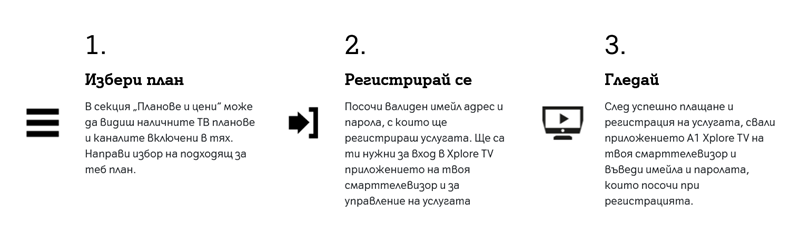 През профила си, който можеш да достъпиш чрез бутона „Вход“, след разгръщане на детайлите за услугата ще видиш бутон „Добави Смарт ТВ“. След като избереш „Активирай“, е необходимо да потвърдиш активацията. След потвърждението изтегли A1 Xplore TV приложение на новия си смарттелевизор от съответния app store. Стартирай го и влез със същите имейл и парола, които вече използваш за услугата.